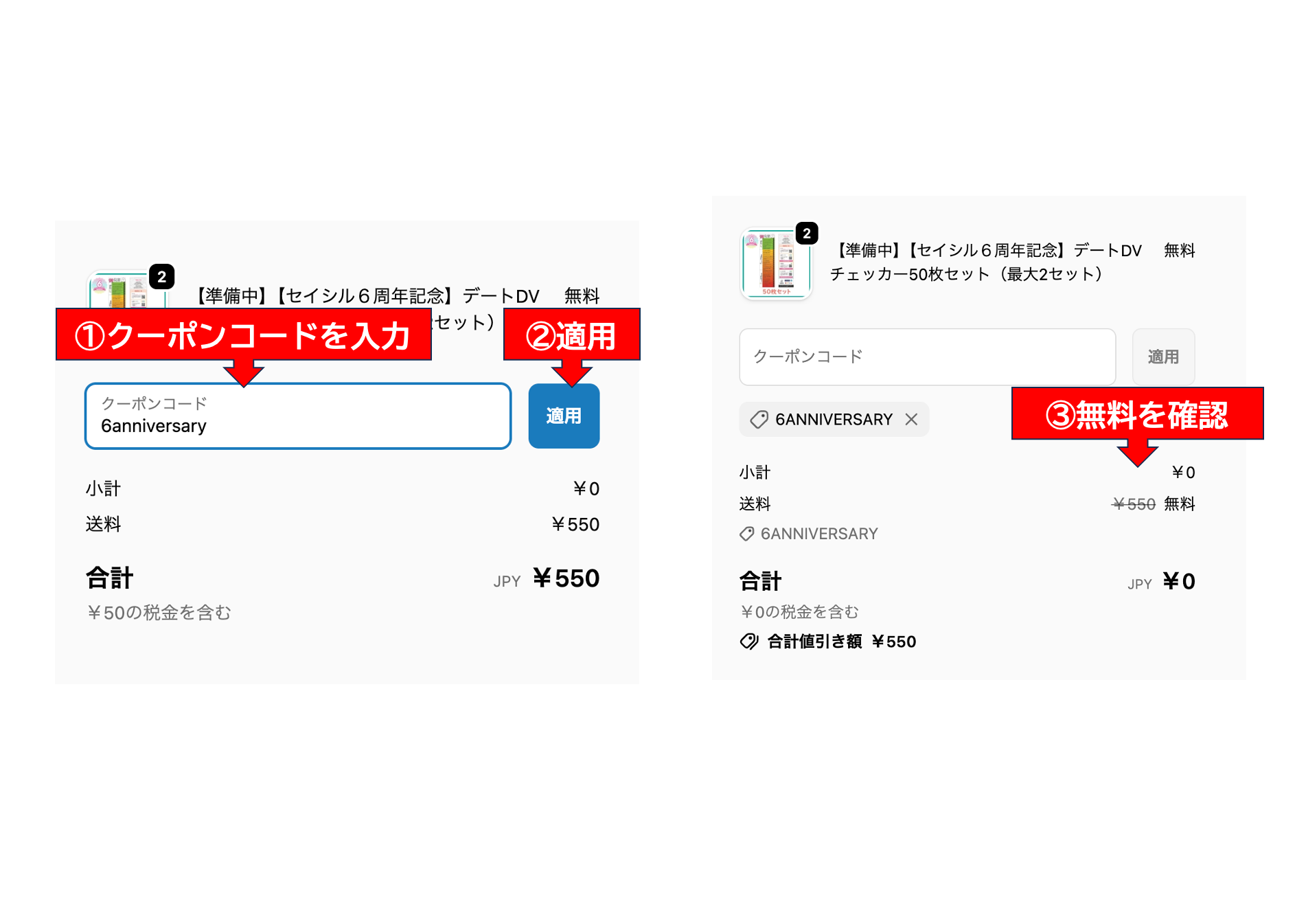 クーポンコード:6anniversary を入力し、必ず「適用」を押してください。(2枚目の画像を参考にしてください)